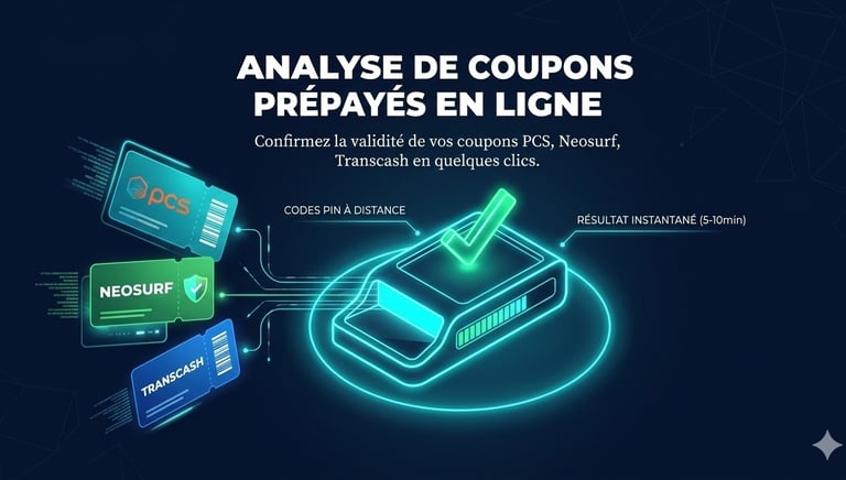Choisissez la sécurité absolue avec notre outil de vérification officiel : un résultat instantané, 100% anonyme et compatible avec tous vos coupons (PCS, Transcash, Neosurf , Paysafecard ect).